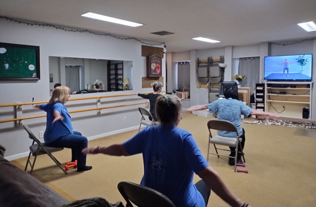 Neither rain nor snow nor ice shall keep the Seated Exercise group away, meeting MWF 9:30-10:30 for cardio, strengthening, balance, and extra work on those abs. It is a drop-in class, so please join us at the Clubhouse!